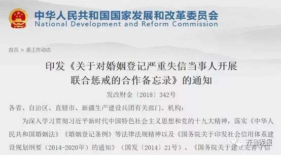 4月初,国家发改委等多部门联合签署了《关于对婚姻登记严重失信当事人开展联合惩戒的合作备忘录》,联合惩戒对象为婚姻登记严重失信当事人。婚姻登记严重失信当事人将面临14项联合惩戒措施。