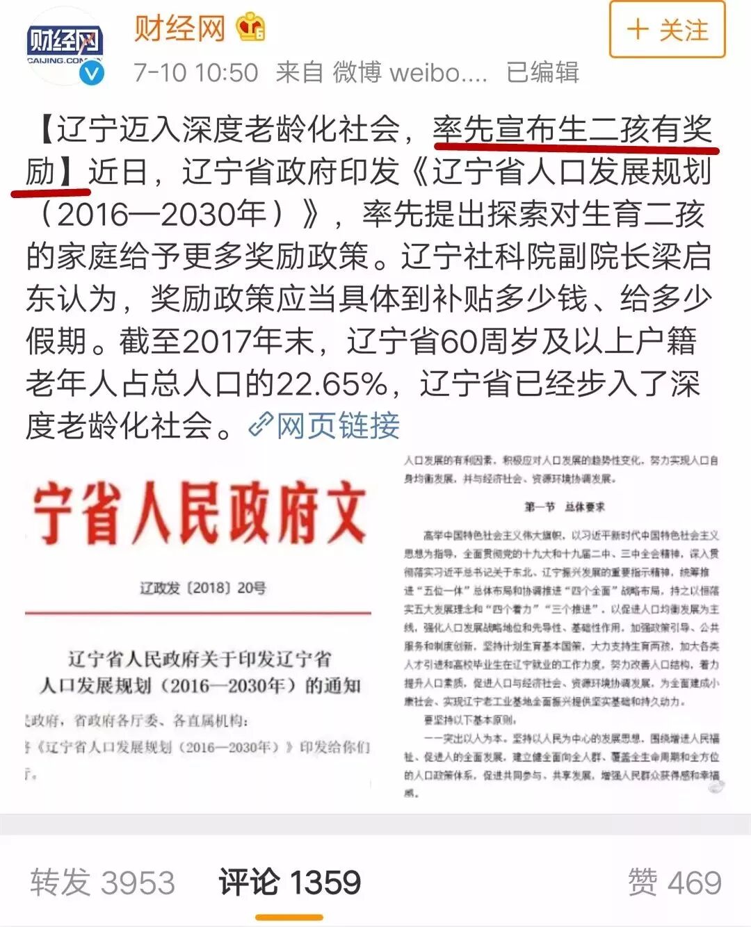前段时间,辽宁率先宣布生二孩有奖励,其他各地也在鼓励生二胎。